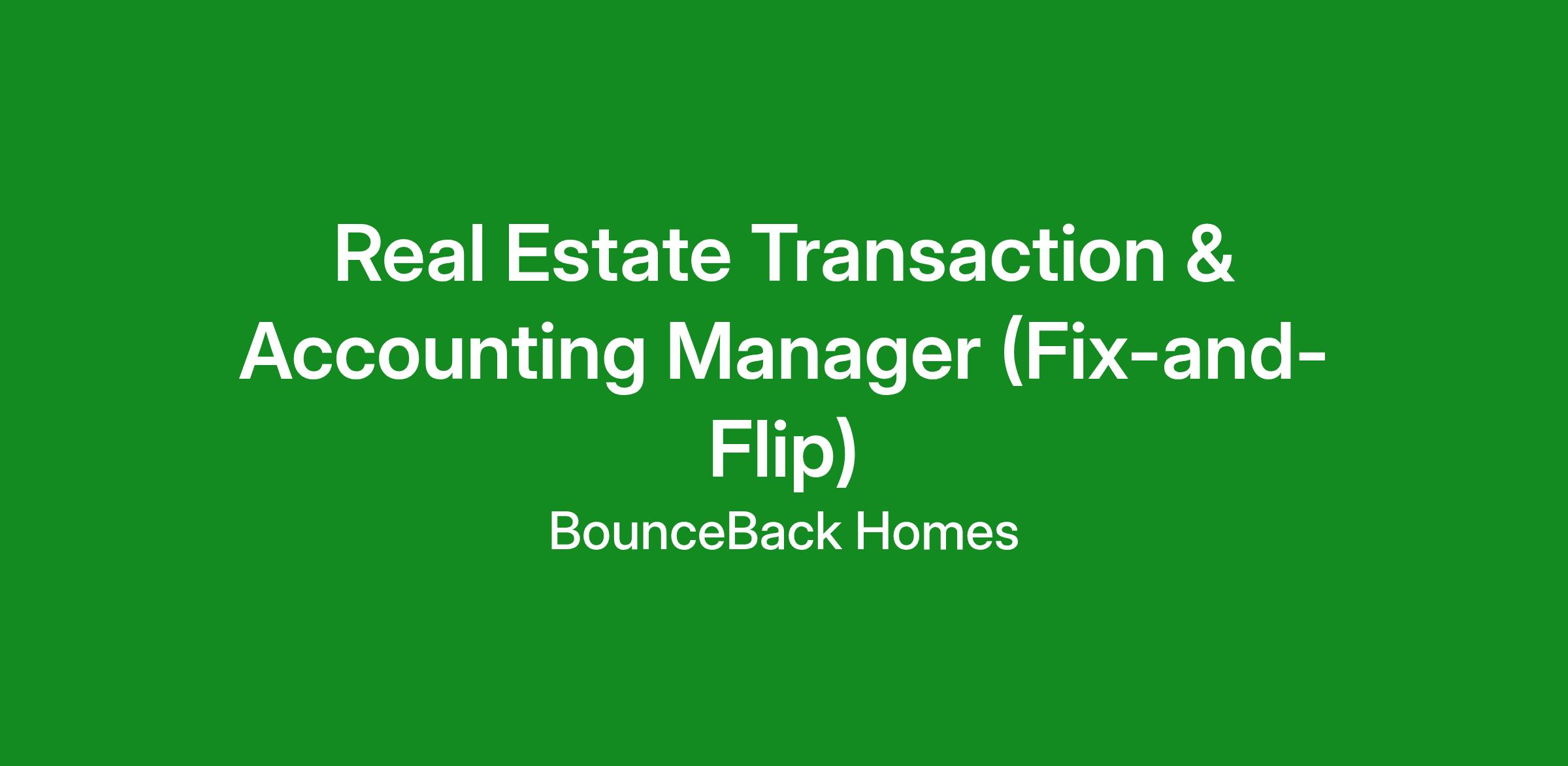 BounceBack Homes is seeking a Real Estate Transaction & Accounting Manager to support the financial and transaction-side operations of its residential fix-and-flip business. This part-time, remote contract role focuses on transaction-level accounting, reconciliation, and coordination with external bookkeeping partners to ensure accuracy from acquisition through closing.
