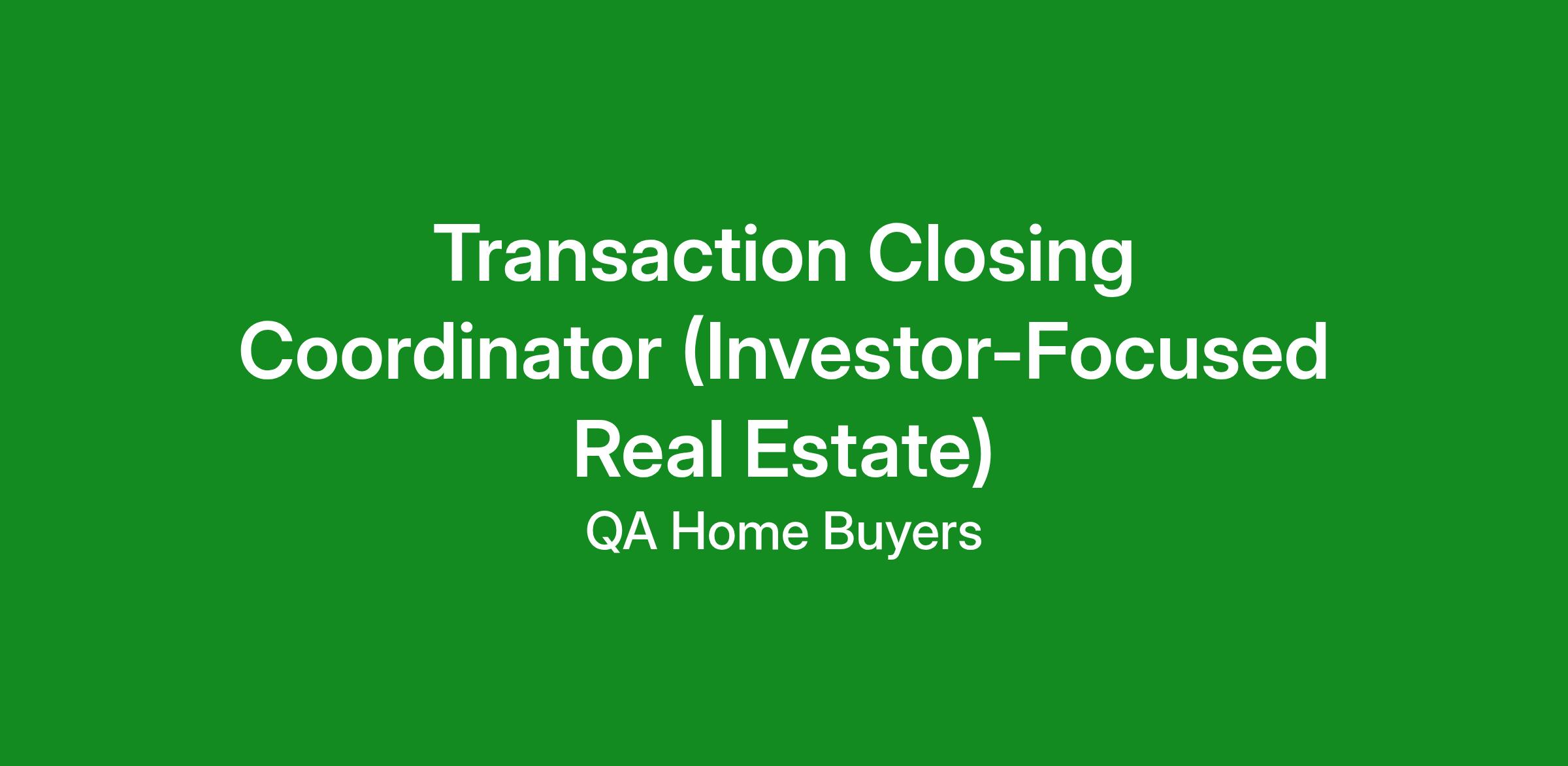 QA Home Buyers is hiring a Transaction Closing Coordinator to manage real estate investment transactions from contract through closing. This full-time remote role supports an acquisitions-focused team and requires hands-on experience with investor-style transactions, including assignments and novations.